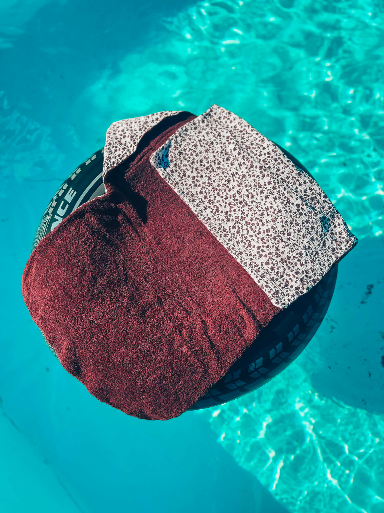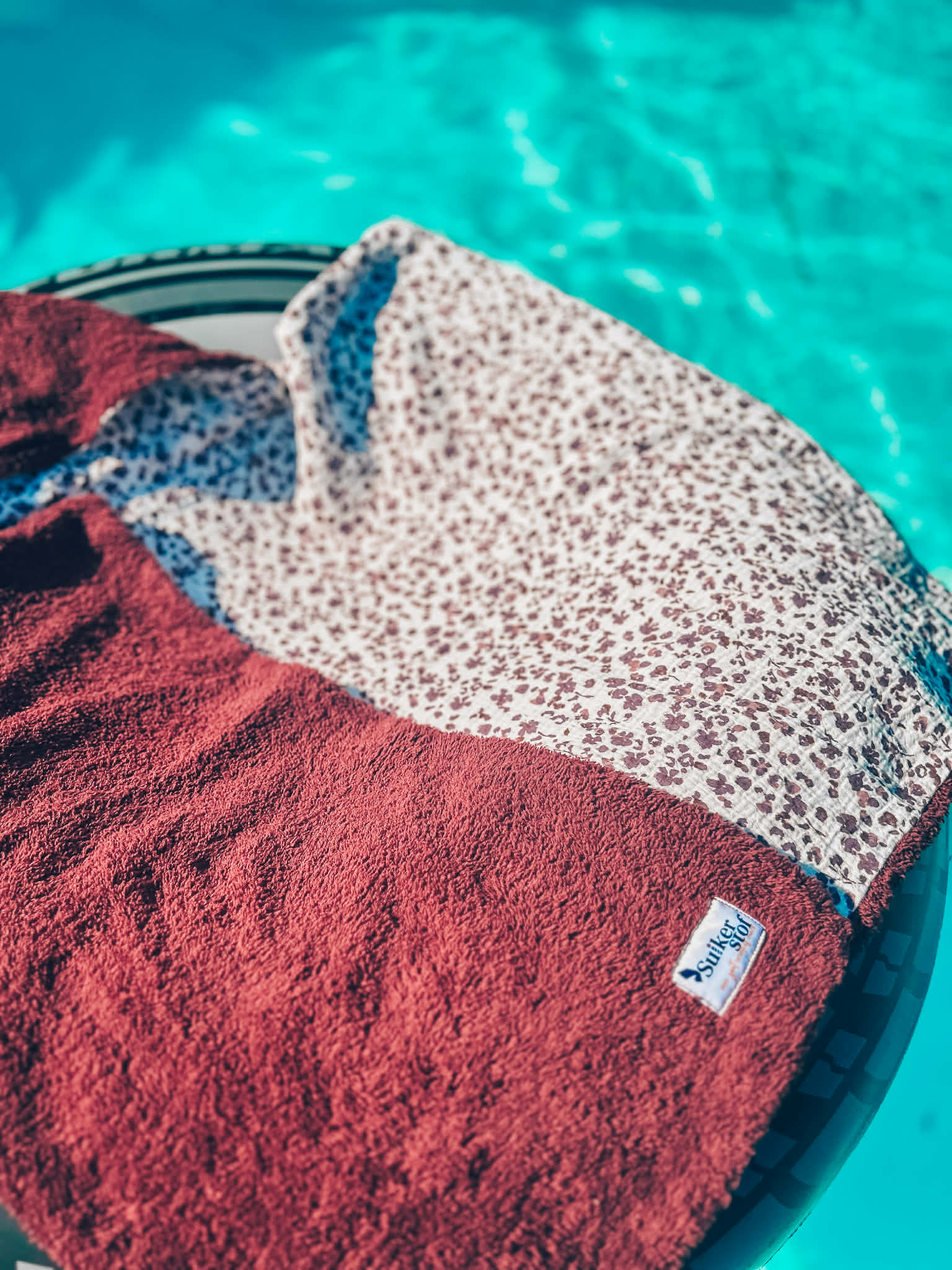 Zachte bordeaux badstof gecombineerd met paarse bloemetjes
